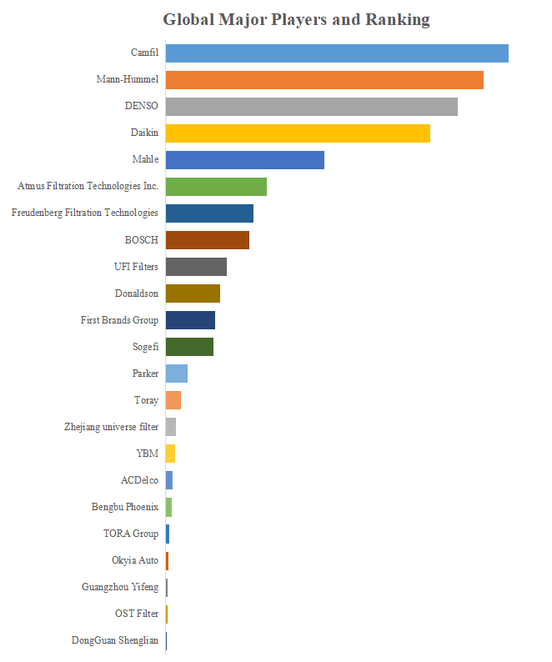 YHResearchのトップ企業研究センターによると、エアフィルターの世界的な主要製造業者には、Camfil、Mann-Hummel、DENSO、Daikin、Mahle、Atmus Filtration Technologies Inc.、BOSCH、Freudenberg Filtration Technologies、UFI Filters、Donaldsonなどが含まれている。2023年、世界のトップ10企業は売上の観点から約41.0%の市場シェアを持っていた。