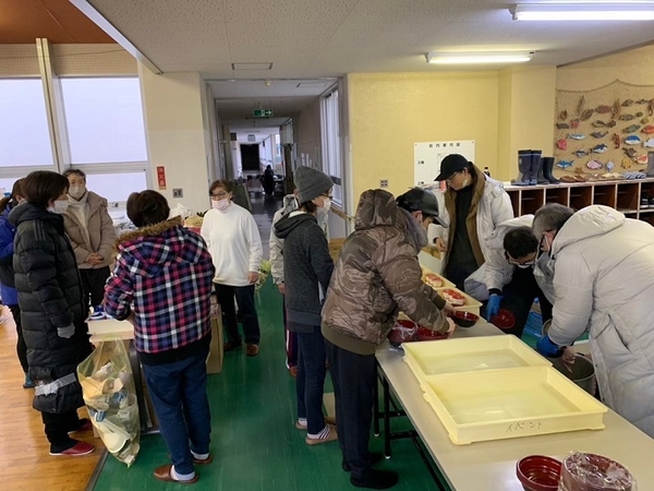 震災派生直後より被災地にて炊き出しを実施。石川県七尾市の小学校・コミュニティセンター等3カ所で1日計300 食(朝・夜)、および中能登町にて1日計200食(昼)の食事提供を実施しました。また、食材・水・資材不足に対応するため、グループ会社と連携し、完全調理品等の食材、水、野菜ジュース、消耗品を現地へ送り届けました。
