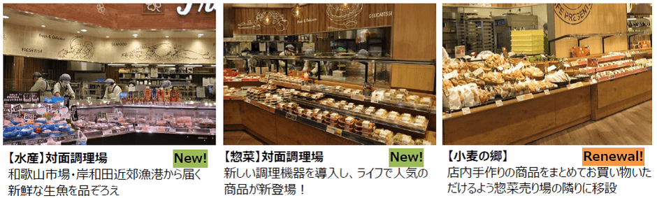 対面調理場を新たに設置し、お買い物のワクワク感を演出いたします。また、手作りパンコーナー「小麦の郷」を惣菜売り場の隣りに移設するほか、食料品売り場を拡大し新商品をご提供いたします。