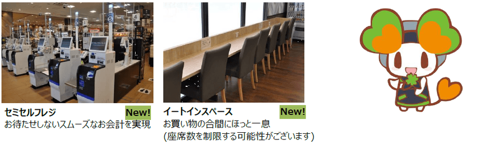 内装と設備も刷新し、セミセルフレジやイートインスペースを新たに導入いたします。また、お子様連れの方やシニア層の方にも安心してお買い物いただけるよう、店内の通路幅を広くいたします。