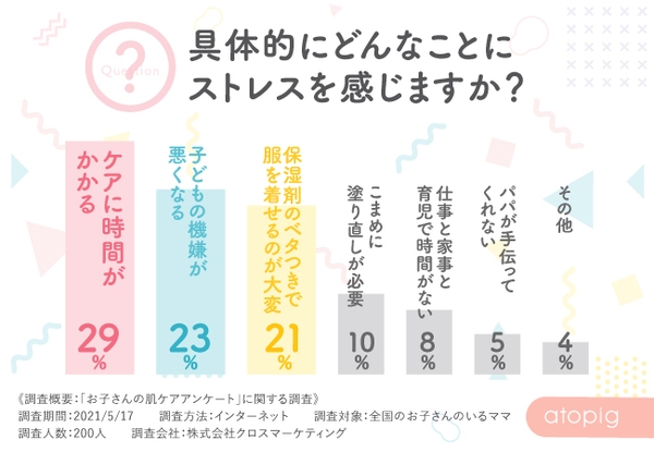 「具体的にどんなことにストレスを感じますか?」と質問したところ、『ケアに時間がかかる(29%)』と回答した方が最も多く、次いで『子どもの機嫌が悪くなる(23%)』、『保湿剤のベタつきで服を着せるのが大変(21%)』、『こまめに塗り直しが必要(10%)』『仕事と家事と育児で時間がない(8.7%)』『パパが手伝ってくれない(5%)』『その他(4%)』という結果に。