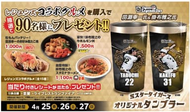 期間中、阪神甲子園球場内売店・ワゴンで「タイガース レジェンズコラボグルメ」をご購入いただいた方の中から抽選で90名様に、「当たり付きレシート」が発行されます。「当たり付きレシート」を内野・外野エリアの「皇蘭」又は「ライブレストランファイア」までお持ちいただくと、「ミスタータイガース オリジナルタンブラー」をプレゼントします。