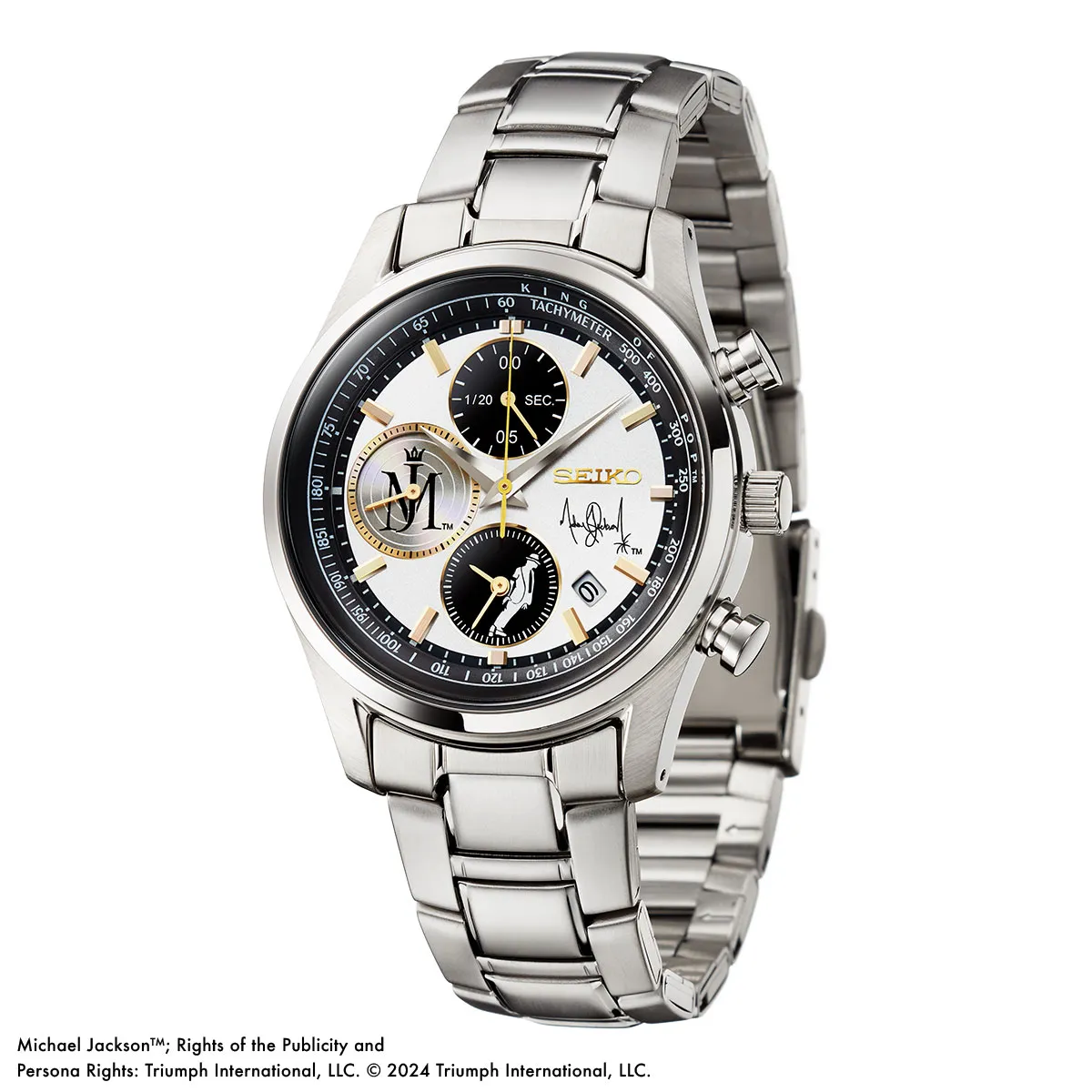 腕時計は、マイケル・ジャクソンのスタイルにインスパイアされたメタルバンドのクロノグラフモデル。白く煌めく文字盤にはマイケルのサインが配され、金色のインデックスが角度によって虹色の光を放ちます。6時位置のインダイヤルには、マイケル・ジャクソンの「ゼロ・グラヴィティ」シルエットがデザインされ、9時位置にはプラチナディスクに想を得たマイケル・ジャクソン マーク入りのインダイヤルが配されています。さらに文字盤を囲む漆黒のラインには、KING OF POPの称号が浮かび上がります。
