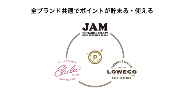 「古着屋JAM」「Elulu by JAM」「LOWECO by JAM」の3ブランドをひとつのアプリにまとめ、全ブランド共通ポイントを導入。デジタル会員証も共通化。