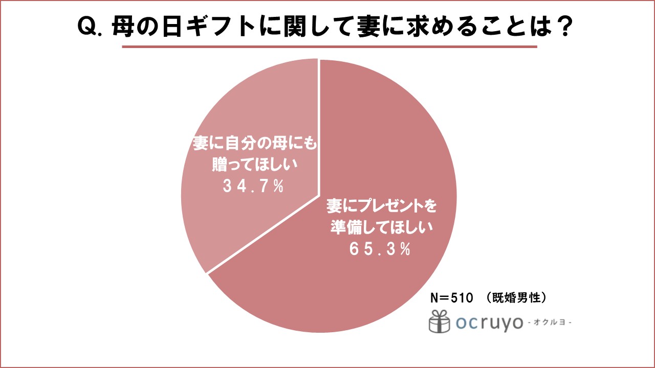 母の日のプレゼントに関して旦那(妻)に求めることはありますか?という質問(複数回答可)では、65.3%の男性が「妻にプレゼントを準備してほしい」と回答。