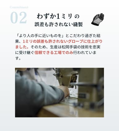 抜群のフィット感を目指し、「より人の手に近いものを」とこだわり過ぎたため、1ミリも縫製の誤差が許されないグローブになりました。そのため、生産は松岡手袋が認めた信頼できる工場でのみ行われています。