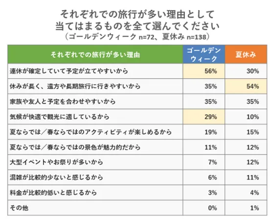 ゴールデンウィークと夏休み、それぞれでの旅行が多い理由についても尋ねてみました。その結果は、次のとおりです。