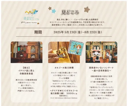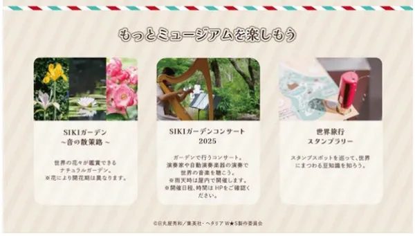 本イベントでは、「MUSIC TRAVEL」をテーマにアニメ『ヘタリア World★Stars』とコラボレーションし、所蔵品のオルゴールなど、欧米でつくられた自動演奏楽器を用いたコンサートなどを通じて世界の文化を楽しむことができます。そのほか、四季折々に300種の植物が楽しめる併設のナチュラルガーデン「SIKIガーデン~音の散策路~」でも世界の花々が鑑賞できます。