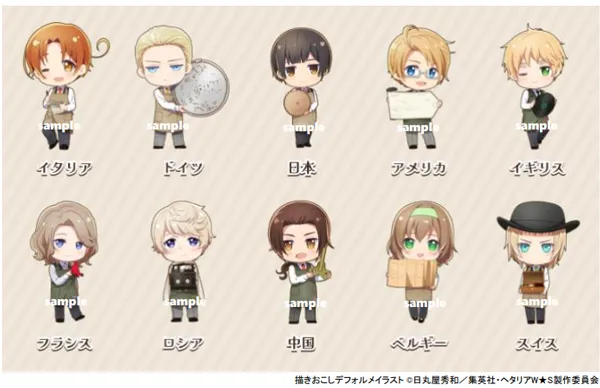 また、描きおこしのデフォルメイラストを用いたオリジナルグッズの販売やカフェのコラボメニュー、『ヘタリア World★Stars』のアニメ原画展示(初展示)、声優サイン入り台本の展示も予定しています。(詳細は次を参照)