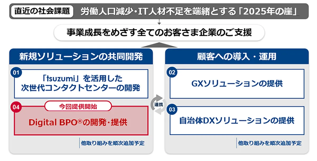 NTTコミュニケーションズ株式会社(代表取締役社長 小島克重、以下 NTT Com)とトランスコスモス株式会社(代表取締役共同社長 牟田正明、神谷健志、以下 トランスコスモス)は、2024年7月17日に締結した戦略的事業提携(以下 本事業提携)に基づき、「Digital BPO(R)※1」ソリューション(以下 本ソリューション)の提供を本格的に開始しました。