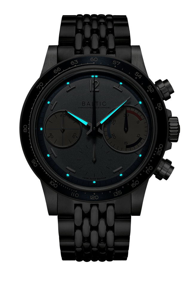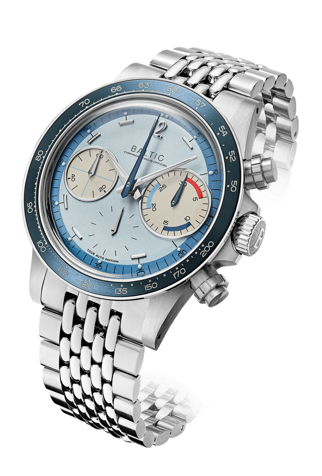 モータースポーツの歴史を反映したディテールを特徴とします。特に「ビッグアイ」レイアウトは、1970年代のレーシングクロノグラフに見られる視認性を重視したデザインで、レース中でも計時を容易にします。さらに、ツール・ド・フランス・オートモービルのオリジナルカラーに敬意を表し、ダイヤルにはさまざまなブルートーンを採用しました。ルミノバのドットに合わせて、文字盤に円を描くインデックスラインを追加しました。これにより、デザインがより洗練された印象になっています。本モデルのダイヤルカラーは、BALTICレーシングチームのクラシックカーのカラーリングにインスパイアされており、ブルートーンとカウンターの配色がそのエッセンスを反映しています。このデザインは、ブランドのレーシングスピリットを象徴し、時計とクラシックカーが一体となる特別なコレクションとなっています。