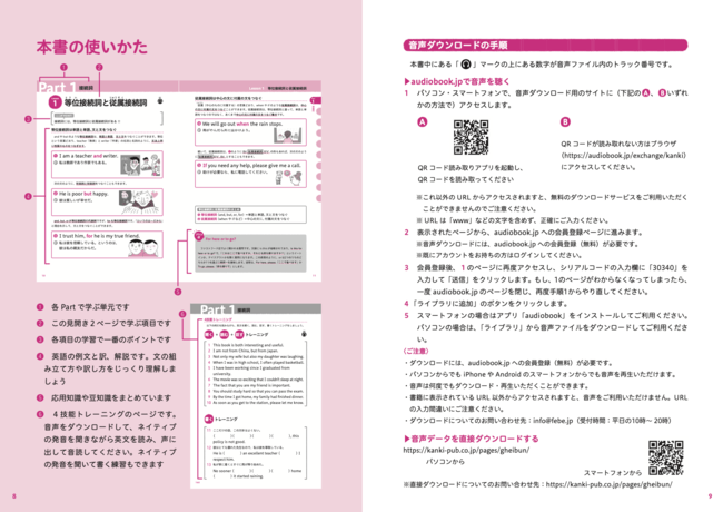 英文法は、4技能(読む・聞く・話す・書く)の根底を支える大切なルールです。巻末にネイティブの発音を集中的に聞いて、口に出して読んで、書いてみるための練習ができるようにしてあります。この本で学んだ英文法と語法の知識を活用して、英語の4技能を高めてください。