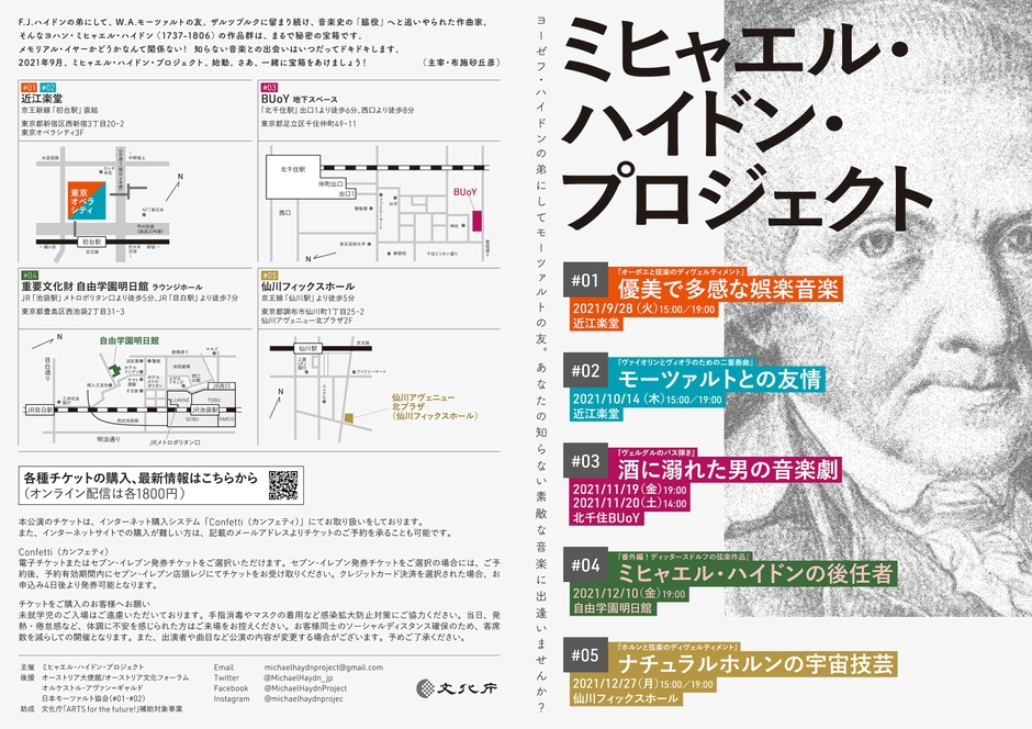 ミヒャエル・ハイドン・プロジェクトは、2021年、コントラバス奏者の布施砂丘彦によって立ち上げられました。素晴らしい作品を残しながらも忘れられてしまった作曲家たちにスポットを当て、その音楽をひろく届けることを目的とした演奏団体です。2021年は、9月から12月にかけて、全5公演を開催いたします。(カンフェティにてチケット取扱中!)