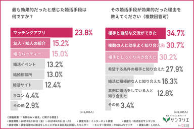 再び全員に、「最も効果的だったと感じた婚活手段」について尋ねたところ、『マッチングアプリ(23.8%)』が最多で、次いで『友人・知人の紹介(15.2%)』『婚活パーティー(15.0%)』となりました。