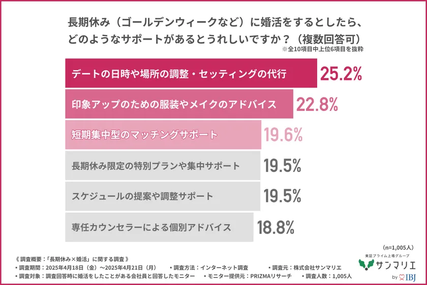 「長期休み(ゴールデンウィークなど)に婚活をするとしたら、どのようなサポートがあるとうれしいか」と尋ねたところ、『デートの日時や場所の調整・セッティングの代行(25.2%)』『印象アップのための服装やメイクのアドバイス(22.8%)』『短期集中型のマッチングサポート(19.6%)』が上位に挙がりました。