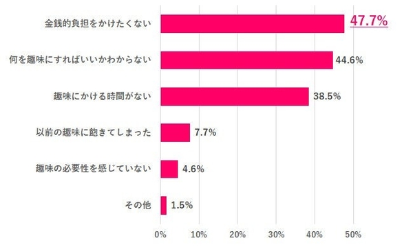 Q.1で趣味がないと回答した人に趣味を持たない理由を聞いたところ、1位「金銭的負担をかけたくない」47.7%、2位「何を趣味にすればいいかわからない」44.6%、3位「趣味にかける時間がない」38.5%でした。一方で「趣味の必要性を感じていない」4.6%は、少数派で何らかの事情で趣味を持たない人が多いことがわかりました。