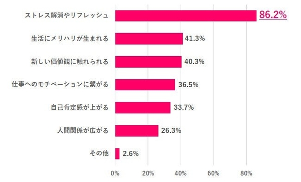 趣味は人生にどんな影響を与えるか聞いたところ、「ストレス解消やリフレッシュ」86.2%が最も多い回答でした。その他のコメントでは「生きがいになる」「暇をつぶせる」などがありました。
