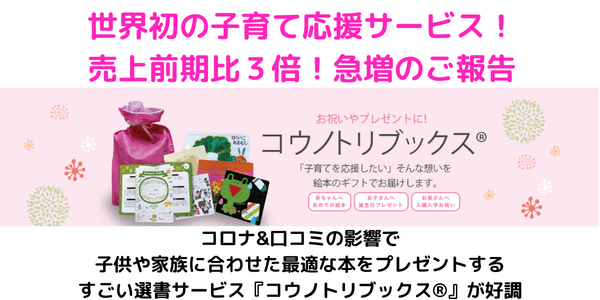 世界初の子育て応援サービス!売上前期比3倍!急増のご報告 コロナ&口コミの影響で子供や家族に合わせた最適な本をプレゼントするすごい選書サービス『コウノトリブックス®︎』が好調