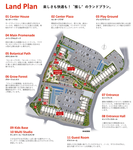 センターエリアは、住まう方の誰もが、暮らしの中で身近な自然と触れ合ったり、上質なサードプレイスとして一息つける、体を動かして遊び、学び、人と人、心と心の「和」を生み出す、「WANOBA(わのば)」として計画いたしました。