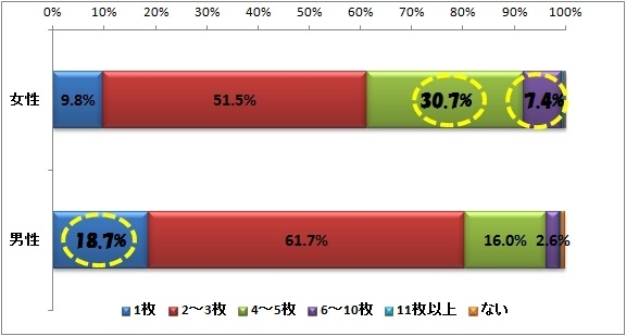 さらに「6~10枚」と回答した方についても男性は2.6%だったのに対し、女性は7.4%となっており、女性のほうが普段から多くのポイントカードを利用シーンに応じて使い分けている様子がうかがえました。