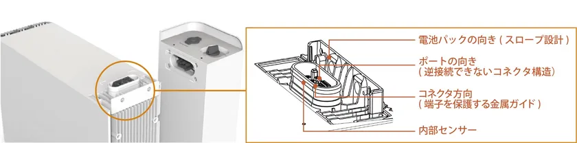 蓄電池内には充放電の中枢となる電池セルが配置され、故障したり異常が起きたりしないように、湿気や熱から守るための、温度を調整するシステムを搭載しています。