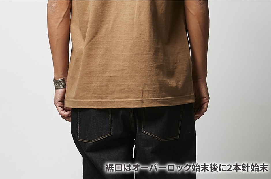ドライタッチな質感のオープンエンド糸を高密度に編みこんだことで、力強くシャリ感のある“ラギッド”な生地に。また、洗いこむほどに生地表面の粗野感が強まり、縮みや型崩れの少ないタフ&アメリカンライクな生地へと育ちます。