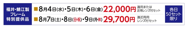 福井・鯖江製フレーム+レンズセットを大変お買得な価格にて、日替わり各日限定50セット限りでご用意いたします。