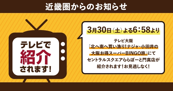 3/30(土)にセントラルスクエアららぽーと門真店がテレビ大阪「北へ南へ買い漁り!ナジャ・小田井の大阪お得スーパーBINGO旅」で紹介されます!