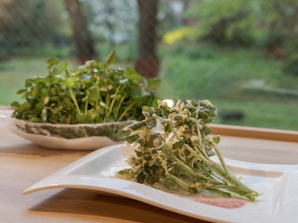 新鮮な新川クレソンは、さっと過熱してもおいしいと教えていただき、さわやかな辛味の素材の味を楽しめるよう「新川クレソンの天ぷら」を提供します。