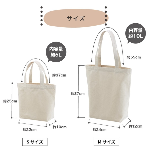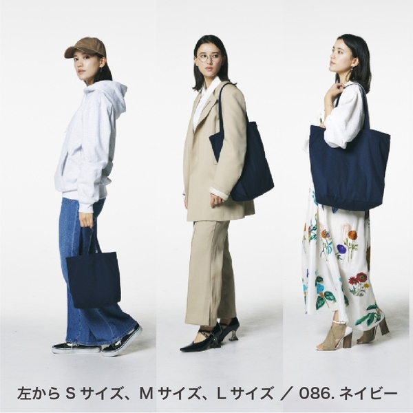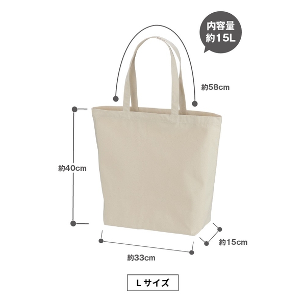 幅広のマチと高さのある設計で、さまざまな用途に対応できる収納力が特徴です。Sサイズは2本の2Lペットボトルが収納でき、コンパクトながらも日常のちょっとしたお買い物やランチトートとして使いやすいサイズです。Mサイズは3本の2Lペットボトルが収納できる絶妙なバランスの良いサイズで、書類、衣類、食品などを幅広く収納できます。Lサイズは6本の2Lペットボトルが入る大容量で、プチ旅行や大量の買い物にも対応できるサイズです。また、衣類やシューズも楽に収納できるため、部活やチームでお揃いにするのにも最適です。日常のさまざまなシーンで活躍する、使い勝手の良いトートバッグです。