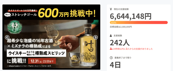 今回、この『“奇跡の樽熟成スピリッツ!”五頭馬 ミズナラ』の先行販売をCAMPFIREのクラウドファンディングで実施中。12月1日から31日までの1ヶ月間という短い期間での初挑戦となるが、開始わずか2日にして目標金額を達成するという快挙を成し遂げた。