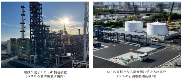 日揮HDとレボインターナショナルは、コスモ石油株式会社と共同で、国内における廃食用油の収集からSAFの製造・輸送・供給にいたるまでのサプライチェーン構築に向けて事業化検討を進め、2022年にSAFFAIRE SKY ENERGYを設立し、国内で発生する廃食用油のみを原料とした年間約30,000KLのSAFの供給を目指しています。2024年12月にコスモ石油堺製油所(大阪府堺市)内においてSAF製造装置の建設が完了し、2025年4月から供給を開始しました。供給するSAF は、国際的な持続可能性認証である ISCC CORSIA 認証を取得しています。なお、本事業はNEDO(国立研究開発法人新エネルギー・産業技術総合開発機構)より採択※を受けた助成事業です。