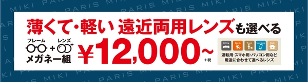 薄くて軽い遠近両用も選べるレンズ付き メガネ1組 12,000円(+税)より、様々なライフスタイルにお合わせしたメガネをご提案いたします。