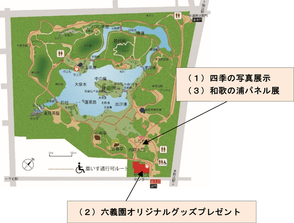 また、和歌に詠まれた景観が映し出された園内の写真や、四季折々の魅力あふれる六義園の風景写真を展示し、一年を通して様々な表情を見せる六義園の魅力を感じていただけるイベントとなっています。