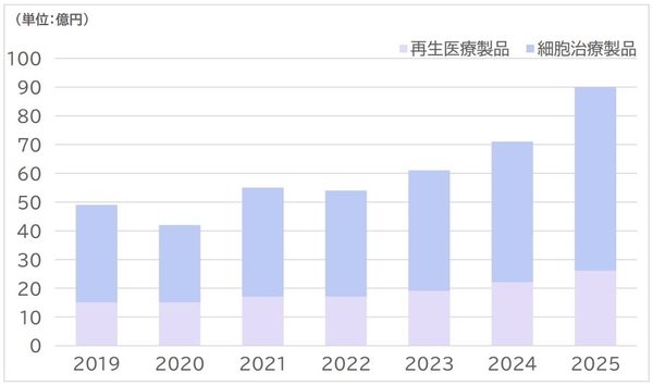 市場規模は、2022年度のメーカー出荷金額ベースで約54億円、うち、再生医療製品が17億円(構成比31%)、細胞治療製品が37億円(同69%)であったと推定される。