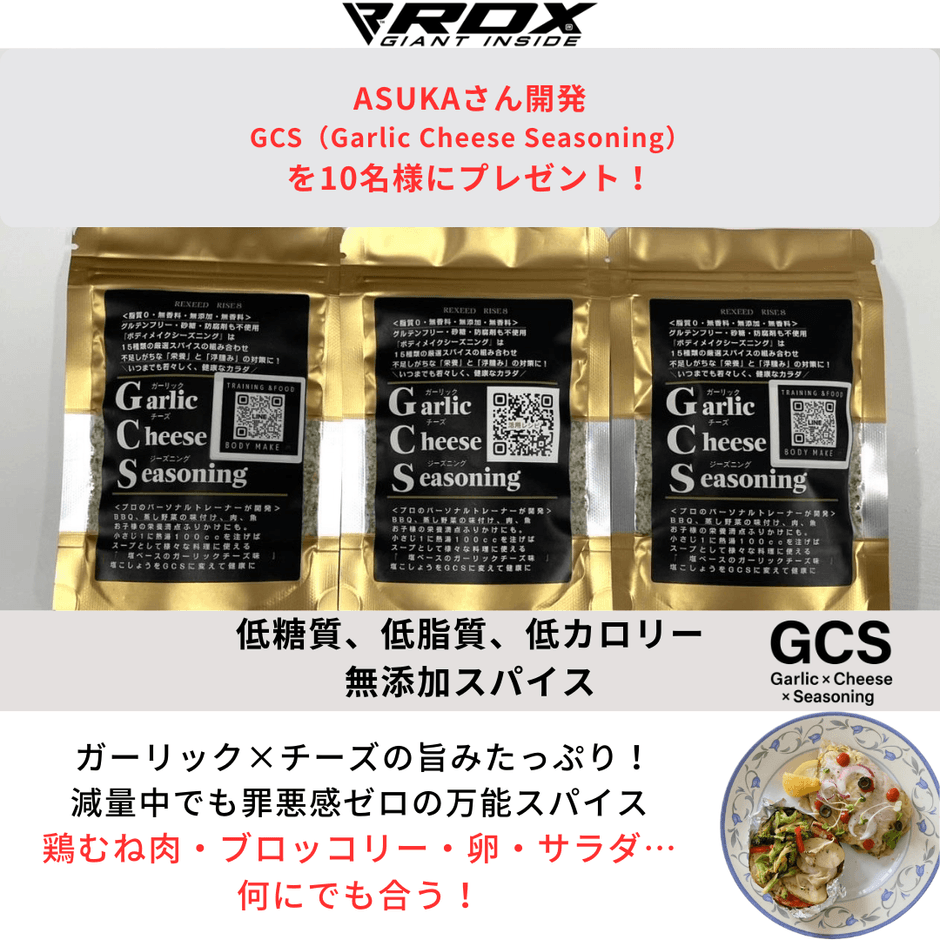 キャンペーンは、Instagramにて開催します。Cycleが運営する「RDX® SPORTS」の公式InstagramアカウントおよびASUKAさん(@asuk.a312_bodymake)をフォローし、かつキャンペーン投稿を「いいね」するだけで参加できます。抽選でASUKAさんが開発したガーリックチーズシーズニング「GCS(Garlic Cheese Seasoning)」を、10名様にプレゼントします。すでに両アカウントをフォローしている方は「いいね」のタップのみで応募することができます。期間は2025年5月12日(月)〜2025年5月19日(月)23:59まで。当選者の発表は@rdx_japan_fitnessのアカウントからDMでお知らせします。