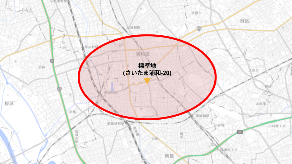 今回は、標準地(さいたま浦和-20)周辺の下記エリア内のマンション事例①(築10年~19年)、マンション事例②(築20年~29年)、マンション事例③(築30年~45年)を対象に、過去5年の一般市場価格を抽出します。