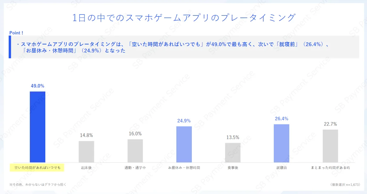 | <調査概要> 調査名 :スマホゲームアプリの利用・課金状況に関する調査 調査方法:インターネットリサーチ 調査地域:全国 調査期間:2025年3月19日~4月9日 調査対象:スマホゲームアプリを普段プレーする男女 実施主体:SBペイメントサービス株式会社 |