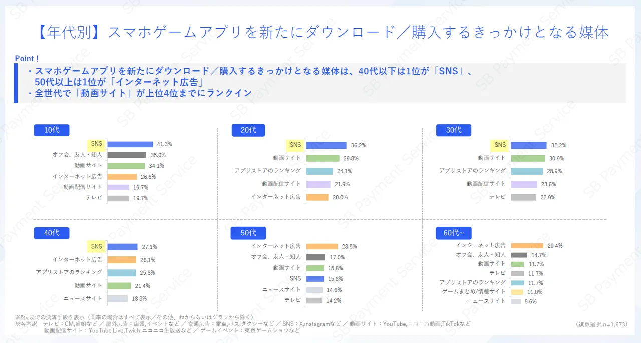 スマホゲームアプリを新たにダウンロード、購入するきっかけとなる媒体を尋ねたところ、1位は40代以下では「SNS」、50代以上では「インターネット広告」という結果でした。また、全世代で「動画サイト」も選ばれていました。