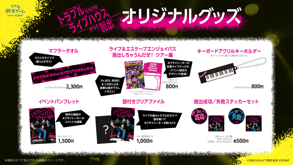 全世界で累計1,490万人以上を動員しているリアル脱出ゲームを企画制作する株式会社SCRAP(本社:東京都渋谷区、代表:加藤隆生)は、2025年5月26日(月)より渋谷CLUB QUATTROを皮切りに全国ツアーをスタートするリアル脱出ゲーム『トラブルだらけのライブハウスからの脱出』のオリジナルグッズを発表いたします。