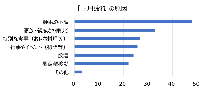 「寝正月」という言葉があるように、正月休みには普段以上にゆっくりと寝て過ごしている方も多いかもしれません。しかし、正月明けに「疲れがあった」と答えた方240人に「疲れの原因はなんだと思いますか?」と尋ねたところ、「睡眠の不調」と答えた方が47.9%と、意外なことに他の原因に比べ「睡眠の不調」が目立つ結果となりました。では、なぜ正月明けに睡眠の不調を自覚するのでしょうか。
