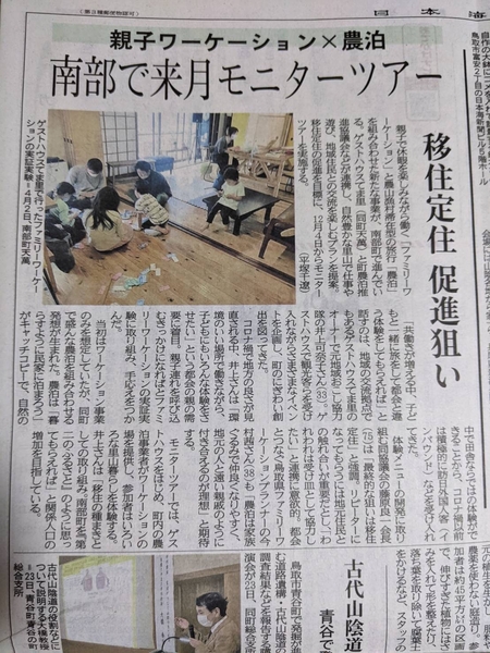 鳥取県南部町は里山の大切さを次世代に伝えるべく、農泊として農家を開放し、第二の故郷として感じてもらうことを目指しています。地域資源の再発見・課題の洗い出しを目的としたファミリーワーケーションの実証実験です。