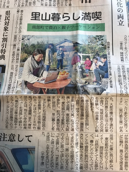 鳥取県南部町は里山の大切さを次世代に伝えるべく、農泊としてお家を開放し、第二の故郷として感じてもらうことを目指しています。地域資源の再発見・課題の洗い出しを目的とし、ファミリーワーケーション実証実験の一母子として参加しました。