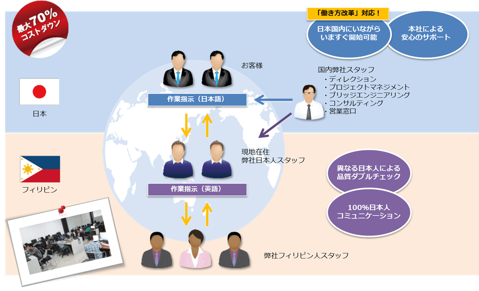 AI向け学習データ作成「セブハイスペックアノテーション」を中心に、オフショア開発や英語サポートを、フィリピン・セブ島に有する自社拠点にて、日本人窓口で高品質かつリーズナブルにご提供します。