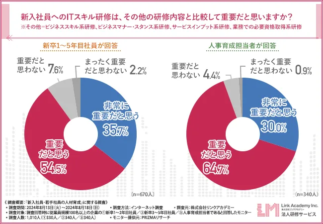 新卒1~5年目の社員、人事育成担当者ともに9割以上がITスキル研修は他の研修よりも重要だと思うと回答。