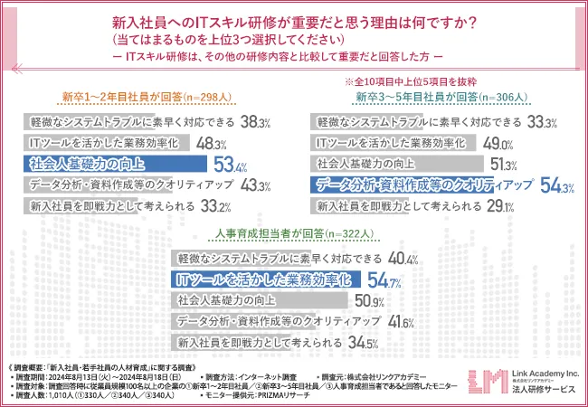 「新入社員へのITスキル研修が重要だと思う理由は何ですか?(当てはまるものを上位3つ選択してください)」と質問したところ、新卒1~2年目の社員53.4%が「社会人基礎力の向上」と回答し、年次の低い社員は自身の土台づくりとして重要性を感じていることが示唆されました。