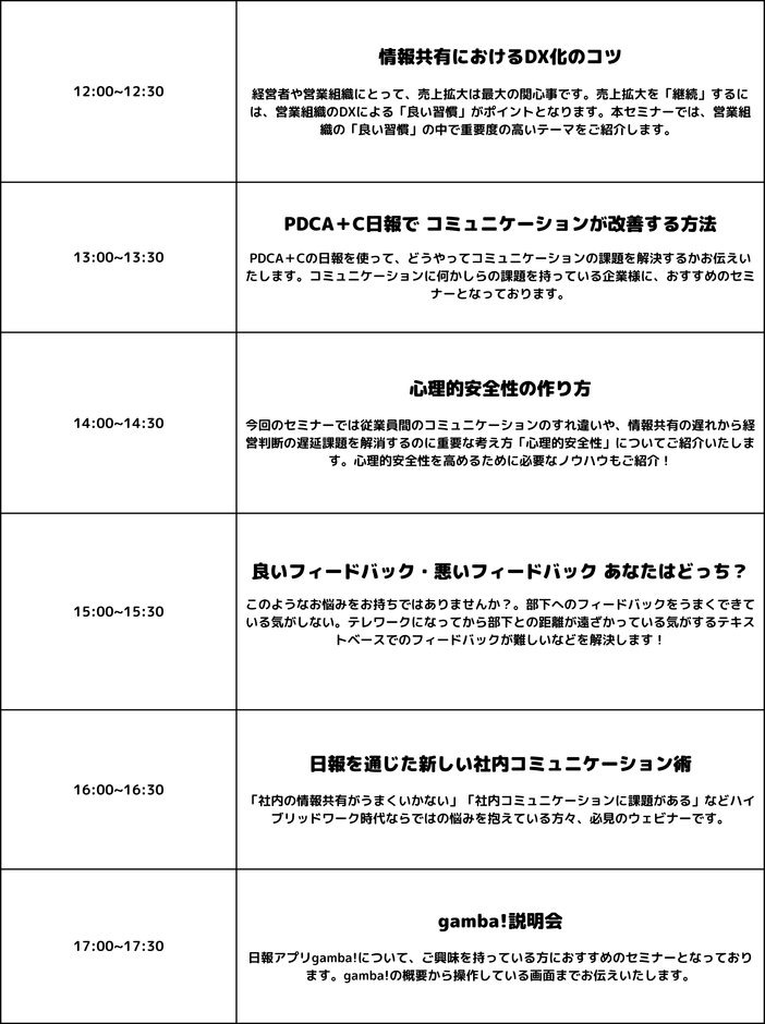 日報共有サービス「日報アプリgamba!(ガンバ)」を提供する株式会社gamba(本社:東京都千代田区、代表:森田昌宏以下 「gamba」)は、2022年に開催された「日報」「DX」「コミュニケーション」「心理的安全」について学ぶことを目的としたセミナーを再放送することを決定しましたのでお知らせします。デジタル時代の到来により、これらの異なるテーマを理解することはますます重要になってきており、非常に便利な1回で包括的なセミナーを提供できることをうれしく思います。