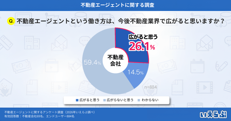 不動産会社に「不動産エージェントという働き方は、今後不動産業界で広がると思いますか?」という質問をしたところ、「広がると思う」(26.1%)、「広がらないと思う」(14.5%)、「わからない」(59.4%)という結果となりました。