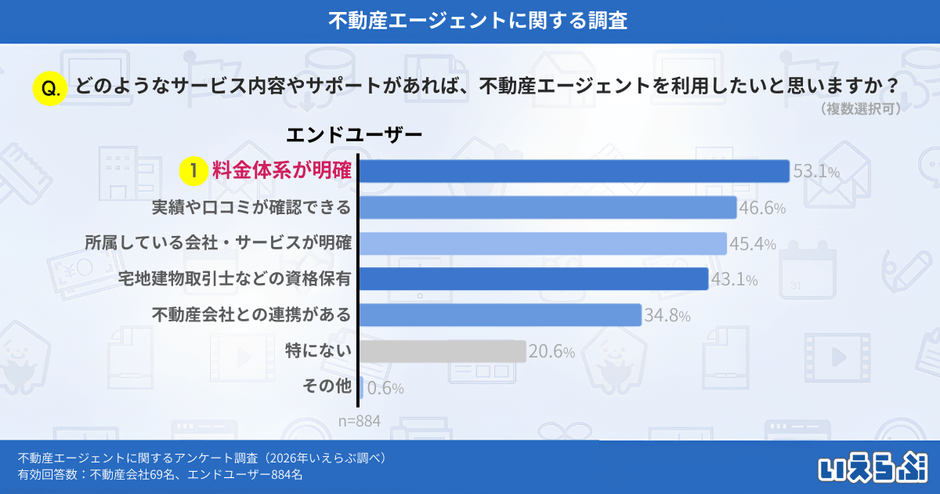 エンドユーザーへの「どのようなサービス内容・サポートがあれば、不動産エージェントを利用したいと思いますか?」という質問では、「料金体系が明確」という回答が最も多く53.1%、次いで「実績や口コミが確認できる」(46.6%)、「所属している会社・サービスが明確」(45.4%)という結果となりました。