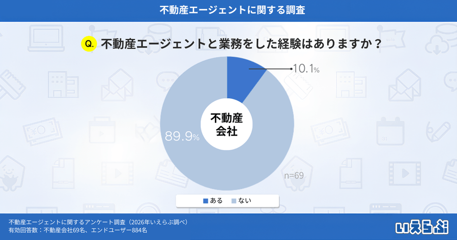 不動産会社に「不動産エージェントと業務をした経験はありますか?」と質問したところ、「ある」と回答したのは10.1%にとどまり、「ない」という回答は89.9%という結果となりました。
